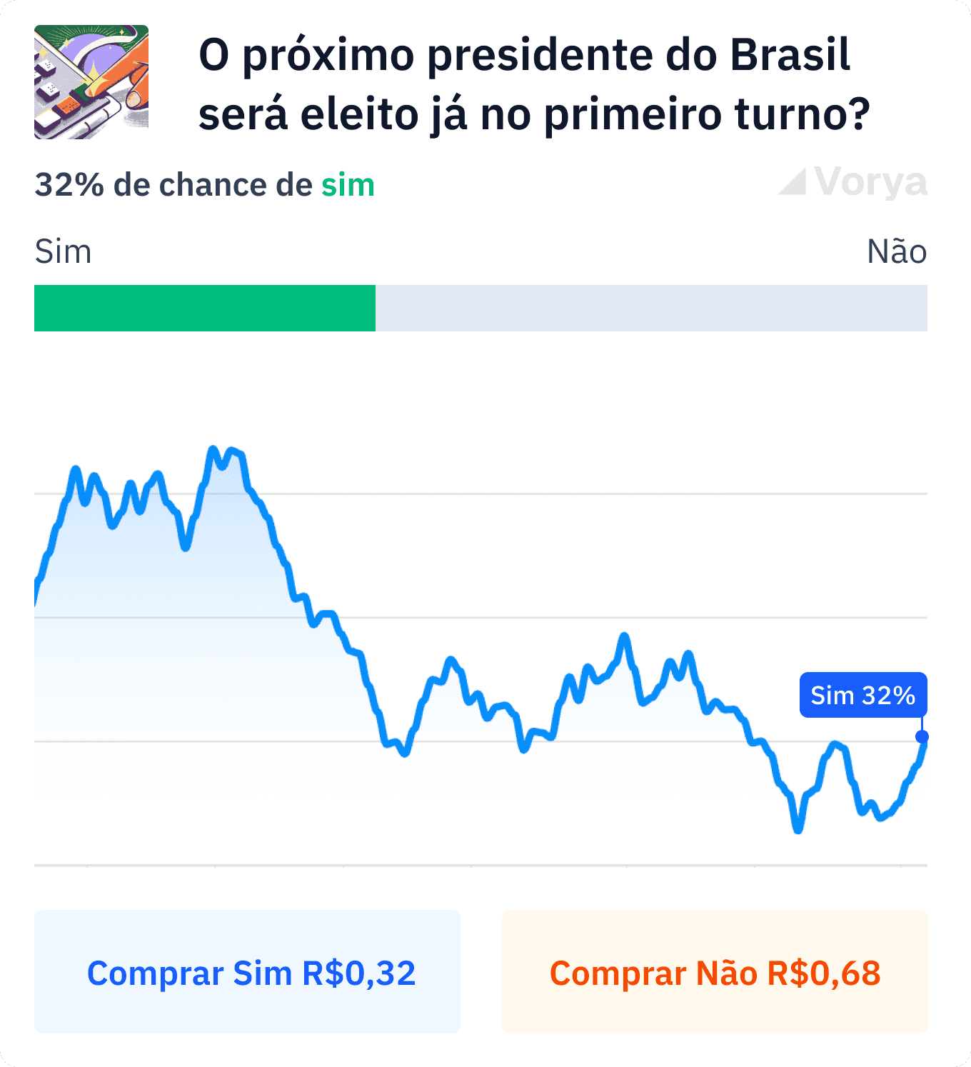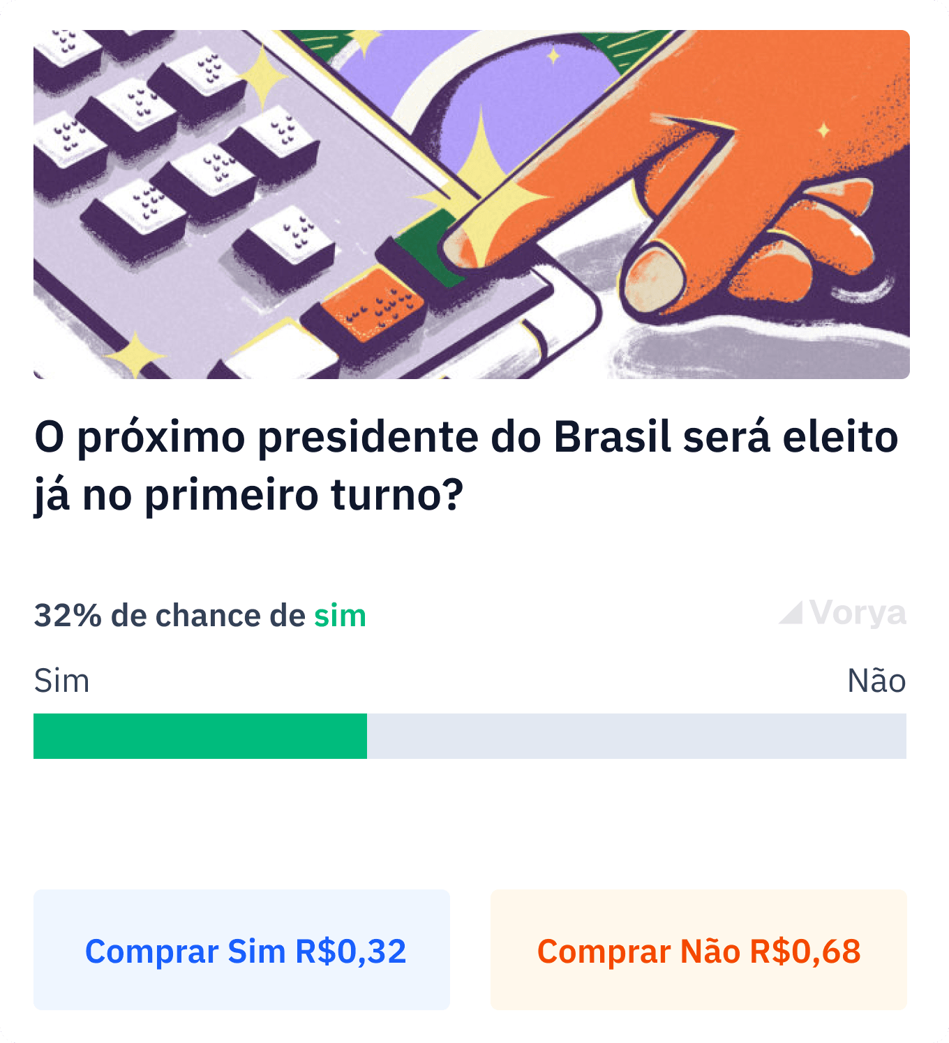 Na Vorya, você pode prever o resultado de eventos reais, da política à economia, e ver em tempo real como o mercado reage.